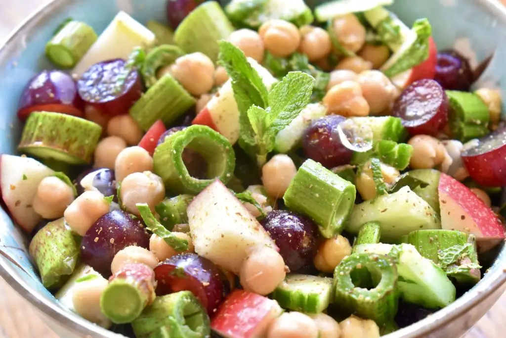 Chaat is a popular street food in South Asia, originating in the Indian state of Uttar Pradesh, which generally combines crunchy, creamy, spicy, sweet, and tangy flavors and textures. There are many (many!) types of chaat out there, but one in particular caught my attention last spring–a refreshing fruit chaat. Fruit chaats are generally made with a mix of in-season fruits, as well as herbs, chickpeas, fruit juice, and chaat masala, the ubiquitous spice blend that ties all of the different chaat varieties together.