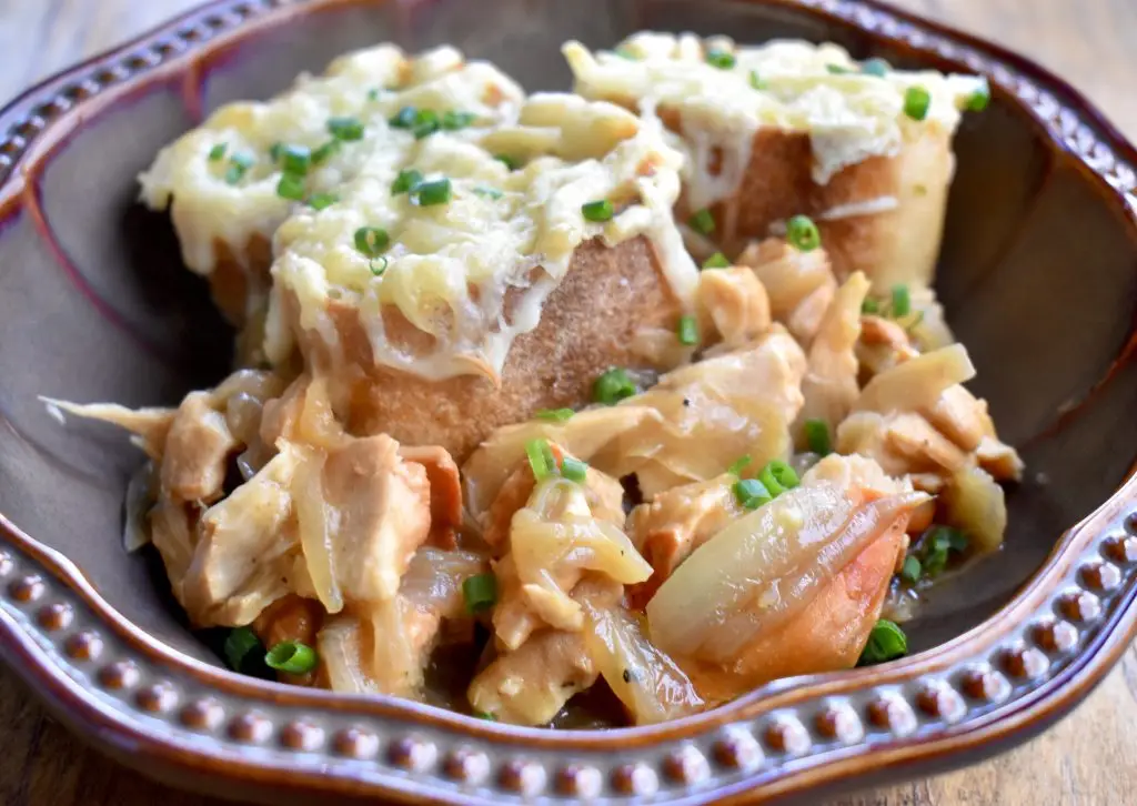 Once onions are done, add them to the pot, stirring them in. Taste for salt and pepper, and add more if need be. Nestle the bread slices on the top, pushing them down a bit. Sprinkle the cheese over top and put it in the oven for 15 minutes, or until the cheese is bubbly and melty. If you’d like a little crisp on top, feel free to broil for a couple of minutes.