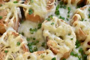 Once onions are done, add them to the pot, stirring them in. Taste for salt and pepper, and add more if need be. Nestle the bread slices on the top, pushing them down a bit. Sprinkle the cheese over top and put it in the oven for 15 minutes, or until the cheese is bubbly and melty. If you’d like a little crisp on top, feel free to broil for a couple of minutes.